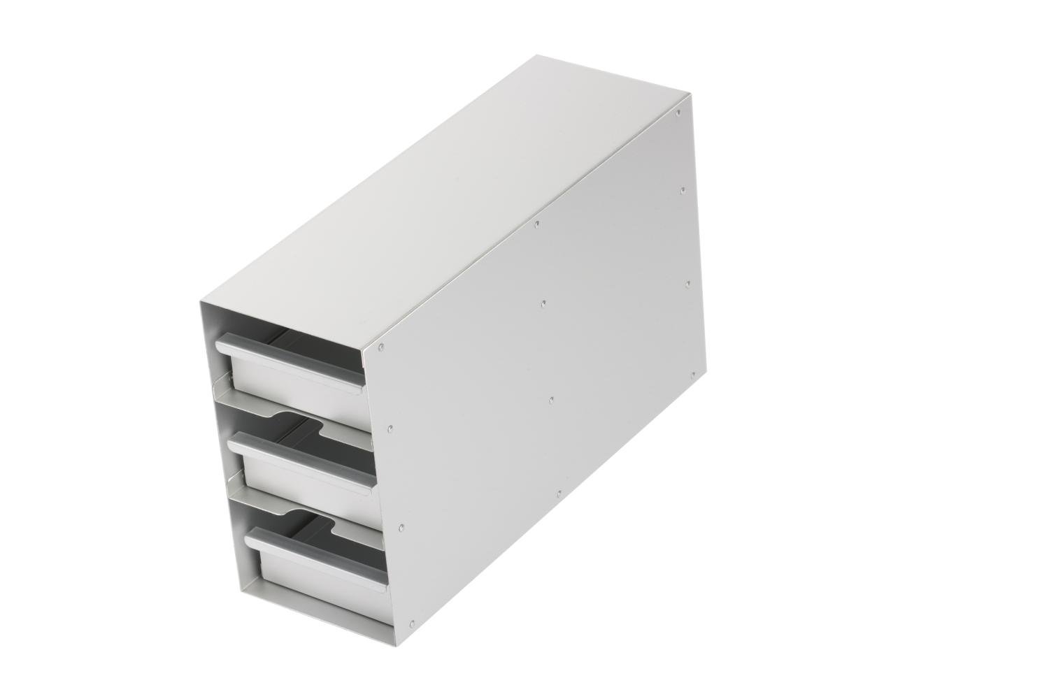 Aluminium storage racks incl. drawers with grip: 3 drawers for 9 boxes, max. height 81 mm