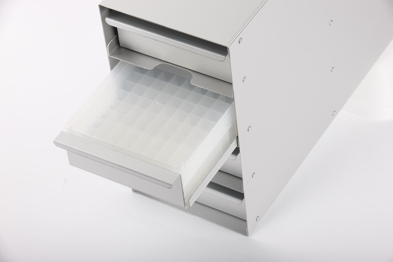 Aluminium storage racks incl. drawers with grip: 4 drawers for 12 boxes, max. height 60 mm