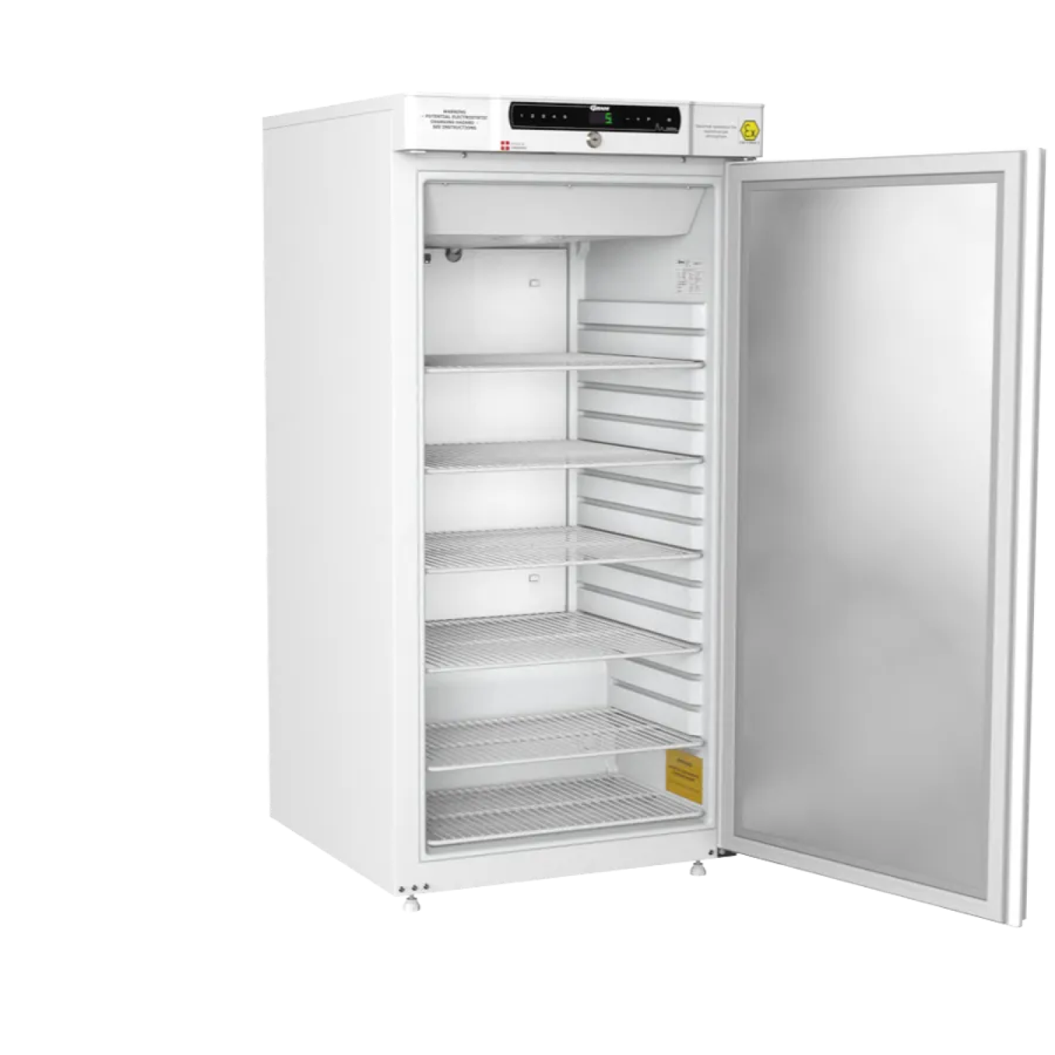 De Gram BioCompact II RR 310 is een medicijnkoelkast tegen een aantrekkelijke prijs. De focus van deze koelkast ligt op veiligheid van uw materialen. Dankzij het dynamische koelsysteem met interne ventilator wordt een zeer homogene temperatuur bereikt in de binnenruimte van deze laboratorium koelkast. De Gram BioCompact II RR 310 heeft een temperatuurbereik van +2°C tot +8°C conform de DIN 13277. Standaard is deze koelkast voorzien van stelpootjes en ATEX classificering. De zelfsluitende deur van de Gram Biocompact II RR 310 is standaard rechts afgehangen (wisselbaar) en voorzien van een slot. Ook is dit apparaat voorzien van een potentiaal vrij contact en akoestisch en visueel deur- en temperatuur alarm.