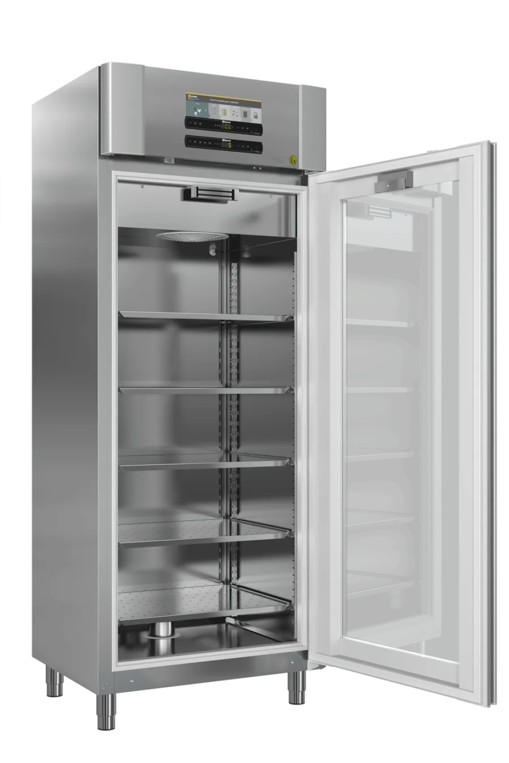 De Gram Exguard ER 660 W koelkast is ideaal voor de veilige opslag van producten welke mogelijk een gevaarlijke atmosfeer kunnen creëren. Deze Gram koelkast is zowel intern als extern ATEX Cat. 3 Zone 2 gecertificeerd. Daarnaast is hij voorzien van een geïntegreerd ventilatie systeem welke via het frontpaneel geactiveerd kan worden. De gebruiker moet ten alle tijde deze knop indrukken om er uiteindelijk voor te zorgen dat de deurmagneet loslaat en de kast geopend kan worden. Zodra de knop wordt ingedrukt zal het interne ventilatiesysteem de binnenruimte volledig afzuigen om zo gevaarlijke dampen weg te halen. De keerklep aan de onderzijde zorgt ervoor dat er schone lucht vanuit de omgeving de kast binnenkomt.